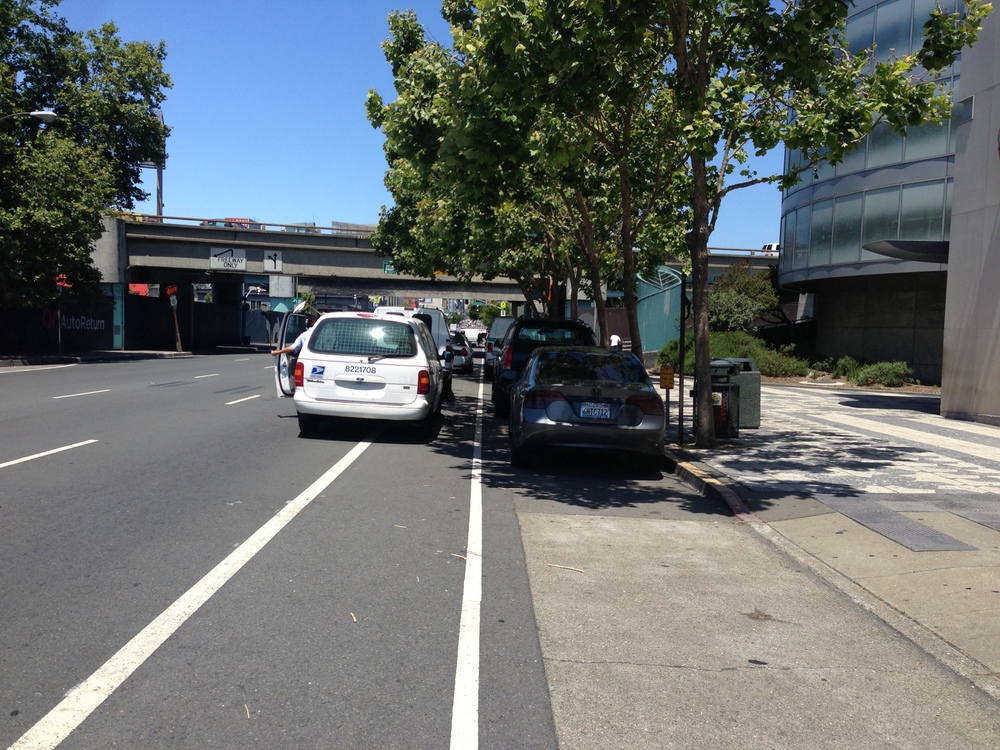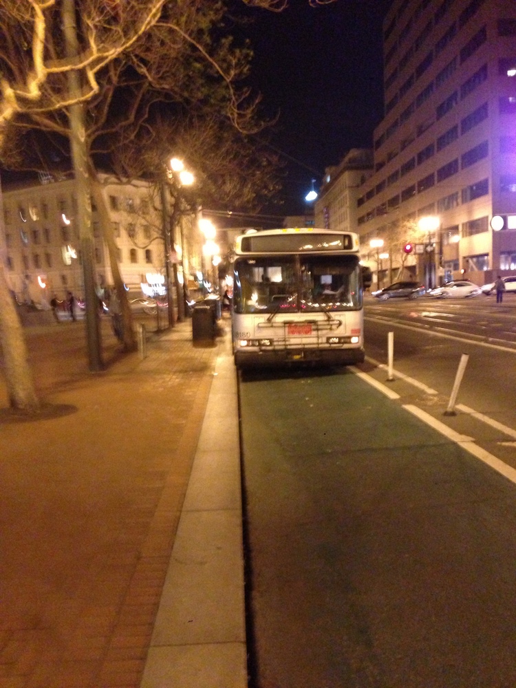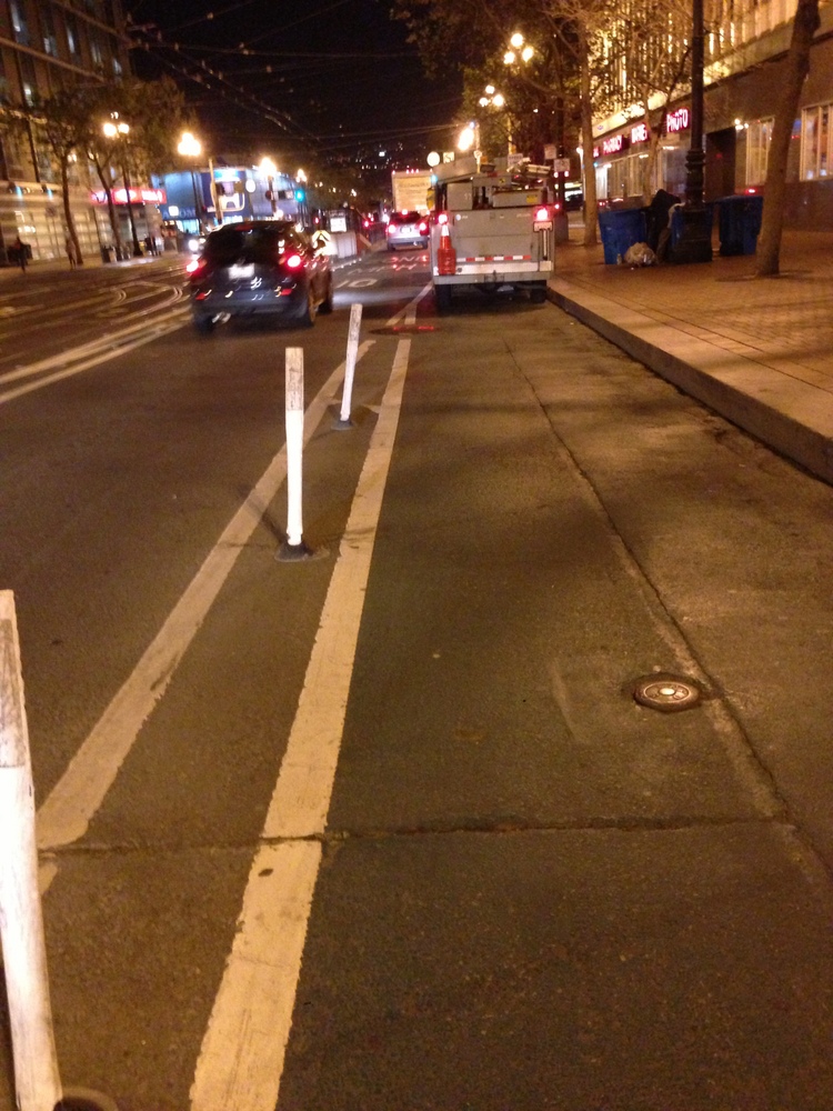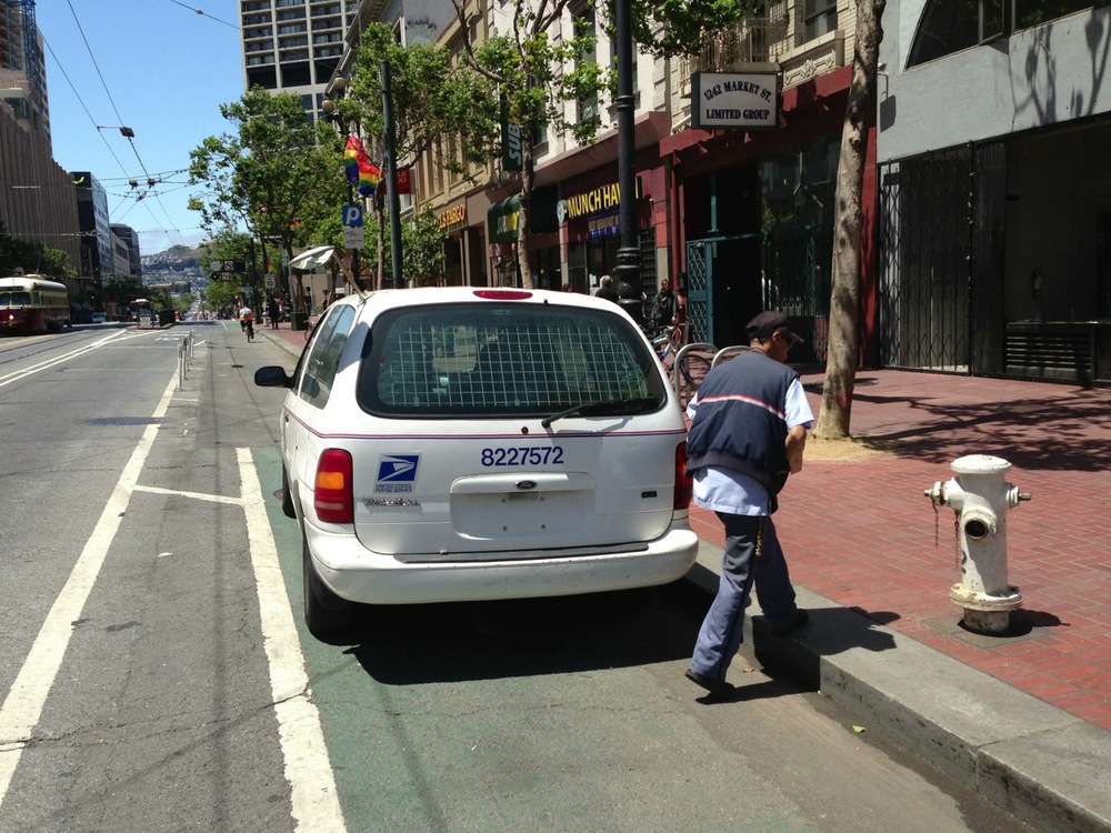 But as any regular Market bike commuter knows, the range of vehicles in San Francisco’s premier “protected” bike lanes is diverse. It includes mail trucks, maintenance trucks, and even Muni buses.