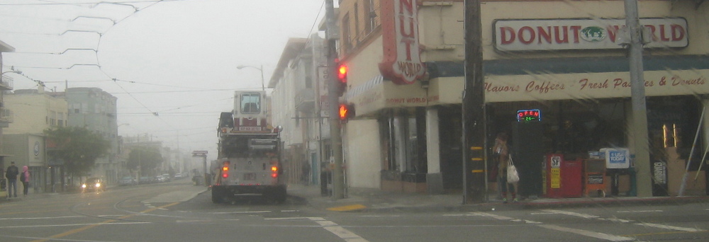 Firefighters get donut and coffee cravings too. James Corrigan spotted this fire truck left blocking a traffic lane on Judah Street at 9th Avenue in the Inner Sunset. While they’re not blocking the N-Judah, at least, the truck was left sitting between a boarding island and the sidewalk, leaving car drivers and bike riders with the choice of illegally using the raised track bed (which is pretty dangerous on a bike), squeezing over or around the island, or using a different street altogether. When Corrigan asked the firefighters about their parking job, he said they just gave him excuses.