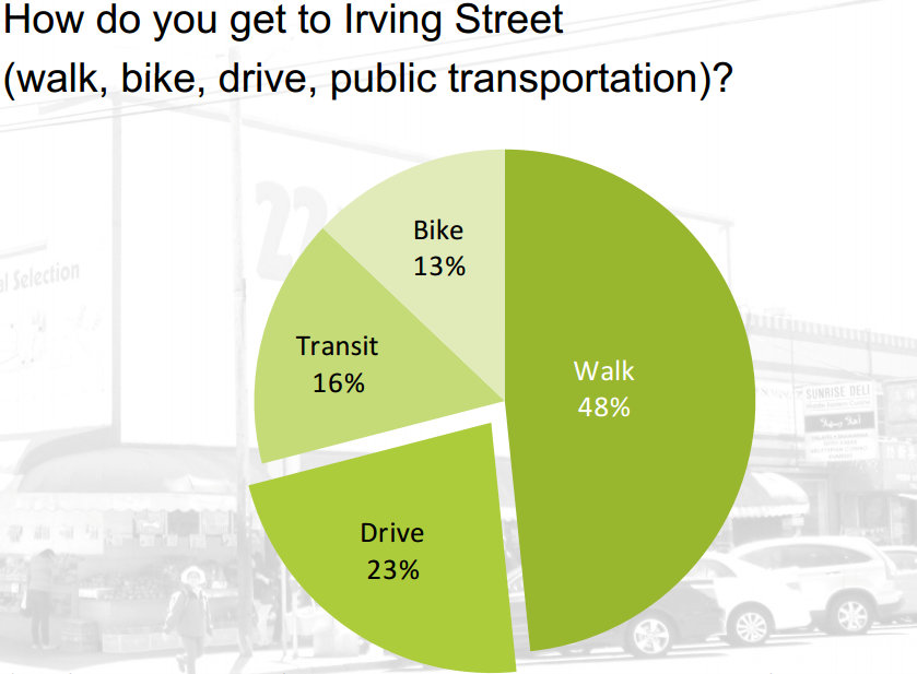 Irving between 19th and 27th Avenues, where the improvements [PDF] are proposed, has more than 400 metered on-street parking spaces on or adjacent to the street, according to the SFMTA. Recent surveys on Geary Boulevard, Polk Street, and Columbus Avenue have all revealed that a large majority of people arrived without taking car. A small, unscientific poll of 30 respondents on Irving, gathered from door-to-door visits and an earlier public meeting, likewise found that most people didn’t drive to get there.