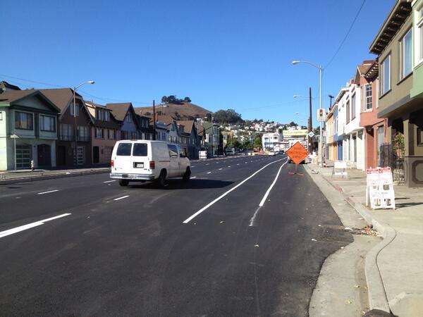 The unprotected bike lanes being installed on Cesar Chavez are part of the ongoing rehab on the section west of Hampshire Street. A photo posted on Twitter last Wednesday shows temporary striping on fresh asphalt, and it’s unknown when permanent stripes will be laid down.