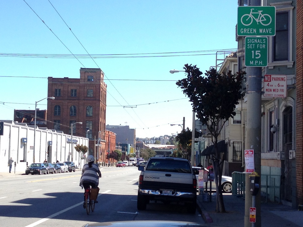 Meanwhile, the new green wave signal re-timing on 11th Street spotted by Mark Dreger comes as a bit of a pleasant surprise. The only other known green waves installed in SF so far are on Valencia and 14th Streets. The SF County Transportation Authority approved funds in April for green waves on five other streets, but 11th wasn’t on the list, and I couldn’t turn up anything on the project. The other five green waves are scheduled to be installed by next March, according to SFCTA documents [PDF]: