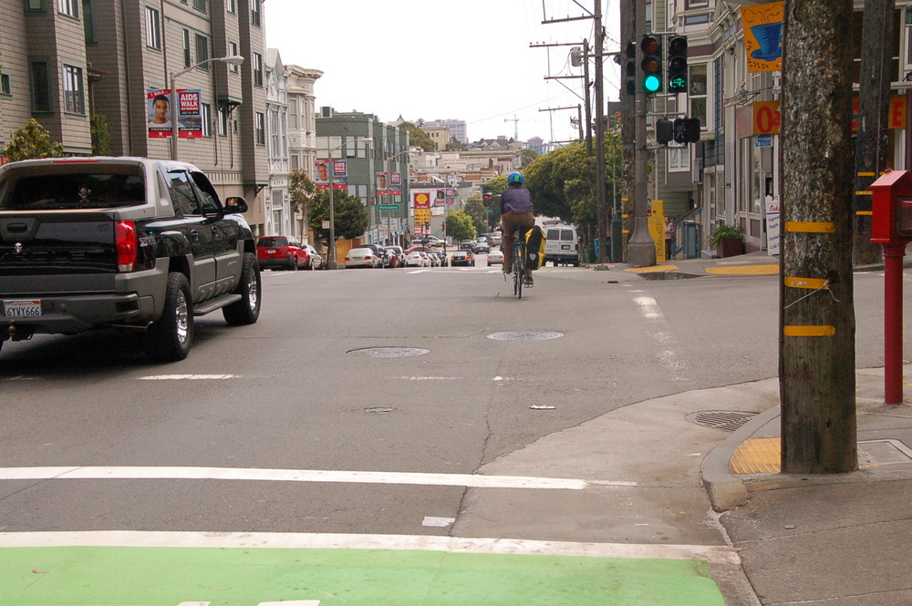 All of the planned safety improvements that don’t involve concrete work are in place. The long-awaited curbside bike lanes on Fell and Oak, currently separated by buffer space and temporary plastic posts, were installed in September 2012 and May of this year, respectively. Along with the lanes, the SFMTA installed bicycle traffic signals and more visible ladder crosswalk markings, while also lowering the synchronized traffic signal speeds from 25 to 20 mph. The block of Baker between Fell and Oak was also put on a traffic-calming road diet and had parallel parking spots converted to back-in angled parking spots.