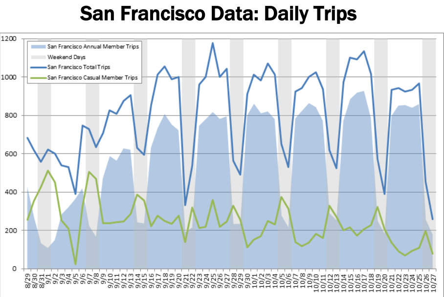 For the entire five-city system, the average is about 1.9 trips per bike per day, up from the rate of 0.92 during the first 12 days after the August 29 launch. At two months in, Bay Area Bike Share’s usage exceeds that of DC’s Capital Bikeshare at the same point in time, according to SFMTA Bike-Share Program Manager Heath Maddox, who told supervisors Monday that the usage rate is “gratifying to see.”