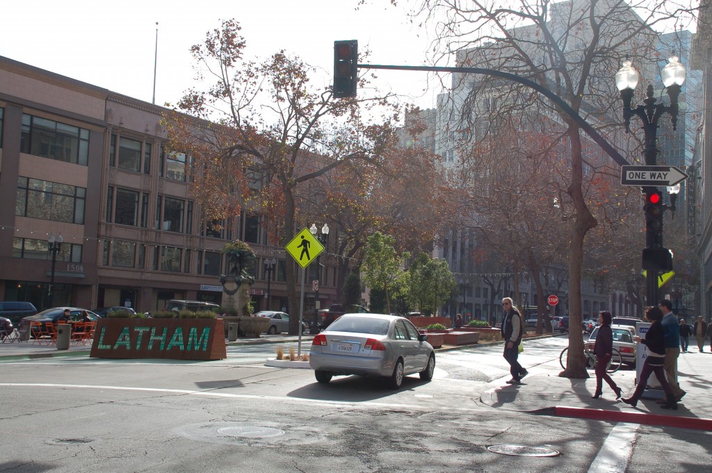 After a trial public plaza at Latham Square was undercut by Oakland’s Planning and Building Manager, the Oakland City Council voted last week to reinstate two-way car traffic on the small, southernmost block of Telegraph Avenue, caving to merchants and developers pushing for unfettered car access.