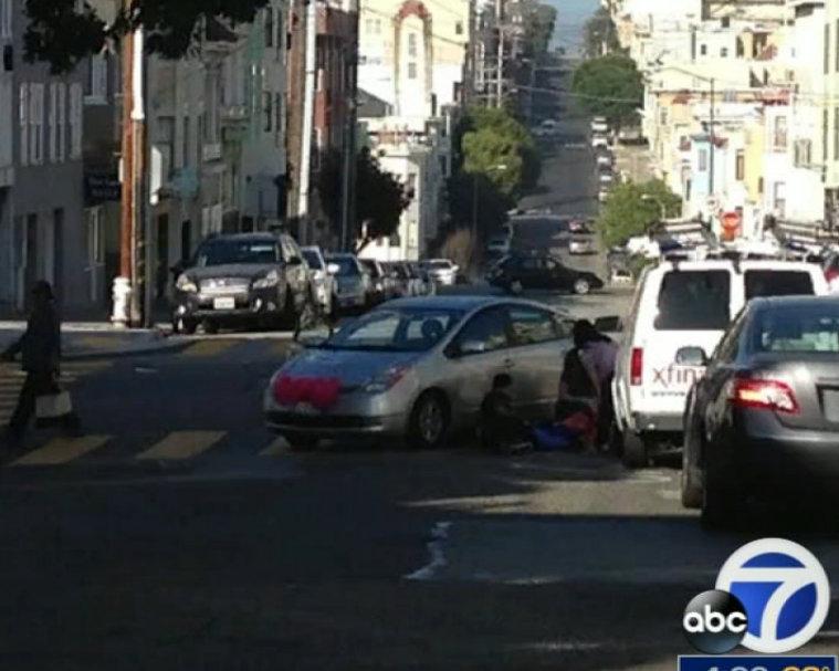 Note the difference between the city’s message to drivers and what it tells pedestrians. While drivers are asked to “be nice” and not run people over, pedestrians get flyers from SFPD depicting a body lying on the street, alongside the words, “It’s of little comfort to know you had the right of way, while you recover from serious injury in the hospital.” How nice.