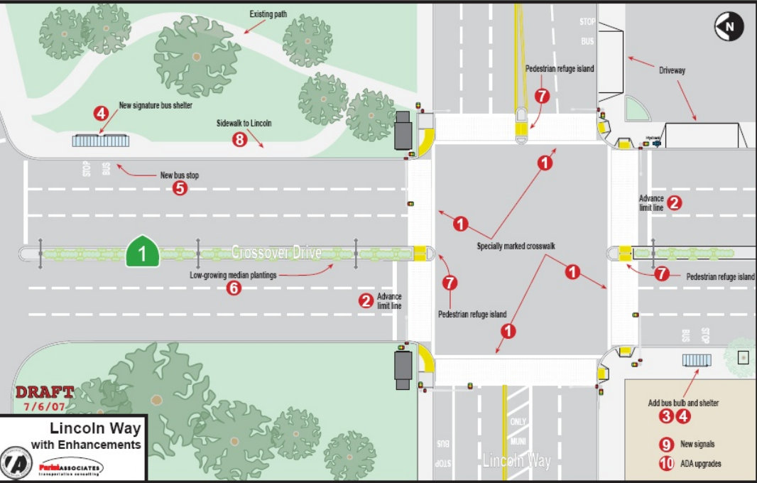 Work was resumed in January 2010. The SFMTA Transportation Advisory Staff Committee (TASC) approved the proposal in March 2010. An environmental clearance from the Planning Department was obtained in July 2010. SFMTA departmental public hearing approved related parking and traffic changes in September 2010. In September 2011, the Proposal was presented [PDF] to OSMPA (Outer Sunset Merchants and Professional Association). The Recreation and Park Commission approved the project in February 2012. Delays occurred again due to a need of directing staff resources to the analysis, outreach, engineering and environmental review related to the Transit Effectiveness Project. In 2013, it was determined that the work will be added to an existing construction contract as a change order in order to expedite. We are now working toward completing the work in summer 2014.