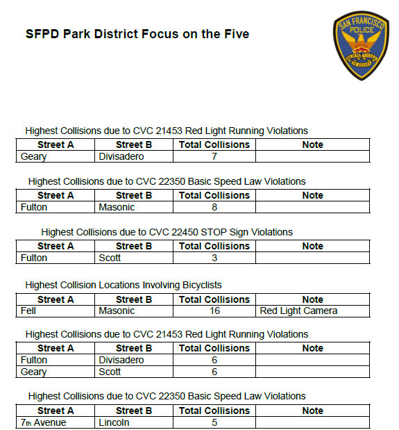 New SFPD data indicates that the Park District’s most dangerous intersections have nothing to do with the Wiggle, where Captain Greg Corrales has devoted his station’s limited traffic enforcement staff to ticketing bike commuters who roll stop signs.