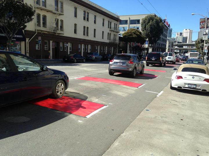 Update 6:09 p.m.: SFMTA spokesperson Paul Rose said “this is a low cost measure to remind and prevent auto drivers from using transit only lanes,” and that the agency will implement the treatments on these street segments this week: