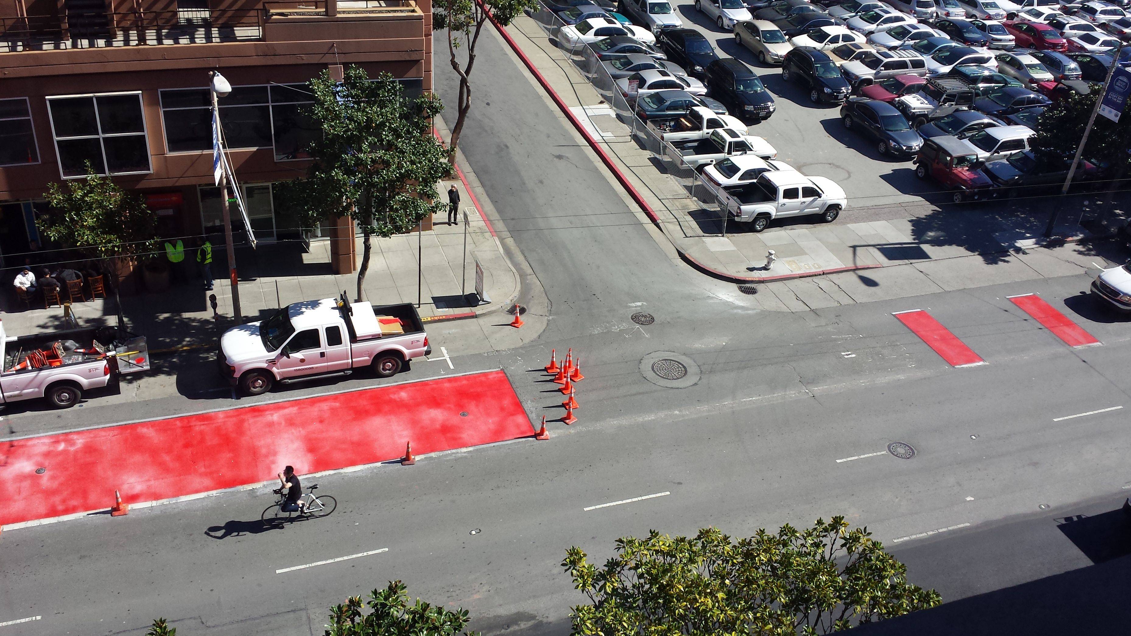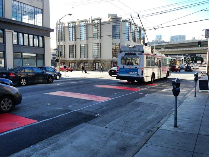 The transit-only lane on Third Street, which tends to have an awful lot of cars in it, got some red paint this week to emphasize what the stenciled paint already says: “Bus Only.” The paint was added to a stretch approaching Bryant Street, where drivers are allowed to cross the bus lane to make a right turn, but not sit in it and block the 30, 45, and 8X lines.