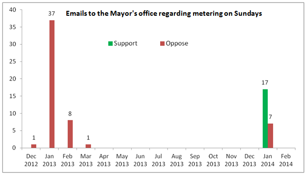 Is this public outrage real? If Lee were really facing an endless barrage of criticism, there would be some record of it. We’d expect to find, for instance, a litany of emails decrying Sunday meters addressed to the mayor. But a public records request to the mayor’s office for all emails about metered Sunday parking turned up just 54 emails protesting or supporting the policy — most of them in January 2013, the first month the meters went into effect, followed by a handful in the next two months.