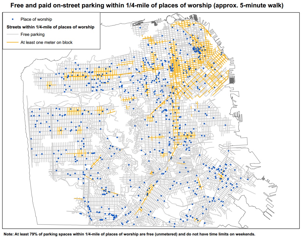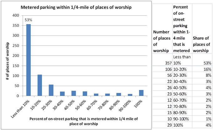 The most bizarre aspect of this whole saga, however, is that the vast majority of places of worship in San Francisco are surrounded by unmetered parking spaces, which means Sunday meters don’t have a direct bearing on most of the SFIC’s membership. We analyzed parking spaces within a quarter-mile of the 668 religious institutions in San Francisco, and found that for 53 percent of them, less than 10 percent (if any) of the spaces within that distance were metered. Another 16 percent had 10 to 20 percent of spaces metered, and only 4 percent were surrounded by 100 percent metered spaces.