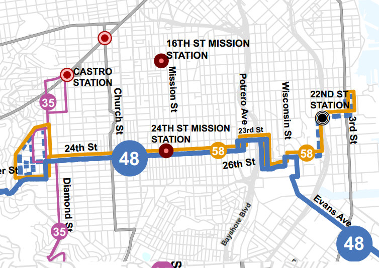48 Quintara/24th Street: The PAG supports the original 48 service change proposal to remove service in the vicinity of Hoffman and Grandview Streets and instead straighten service along Clipper and Douglass Streets. However, the PAG supports maintaining the 48’s current alignment until the new 58 24th Street route is introduced, which is proposed to serve the former 48 alignment along Douglass Street, 21st Street, and Grandview Avenue.