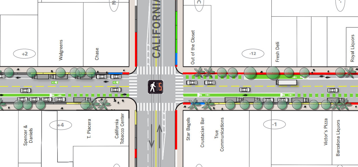 On the northern stretch, between California Street and Broadway, the southbound direction will have a conventional bike lane running between parked cars and moving cars, while northbound will have a part-time bike lane, with parking banned along the curb during morning rush hours. That ban was originally proposed for the northern blocks between Broadway and Union Street, but Montoya said they will retain full-time parking there because parking bans could exacerbate the double-parking problems on that stretch. Instead, he said planners will add a number of loading zones and green “short-term parking” zones to keep stopped vehicles curbside.