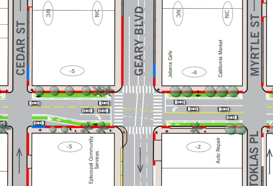 Between McAllister and California Streets, the northbound bike lane will be raised on a curb, with merging zones for drivers turning right at the streets that allow turns in the eastbound direction. The southbound direction will include a buffered, painted bike lane, running to the left of the curb or parked cars, depending on the block. Bicycle riders will be protected from right turning drivers on that side of the street with separate bicycle signal phases and right turn lanes for drivers.