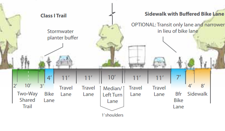 Reducing El Camino Real to four lanes would reduce unsafe speeding, and free up space for shared bike/ped paths on either side of the street. But the design would have to be approved by Caltrans, and Alta estimates its cost at nearly $6 million. Bike advocates say there are far cheaper ways to construct such paths, like a trial phase that simply stripes protected bike lanes.