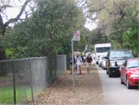 Since “preserving the scenic, rural character of Atherton is extremely important to town residents,” the town’s General Plan and Municipal Code prohibit sidewalks and vertical curbs. The plan recommends streetscape elements in that vein, such as logs, rocks, and vegetation that separate road shoulders from walking paths.
