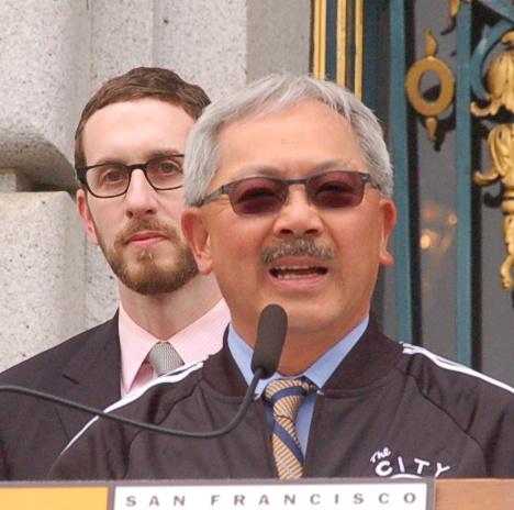“Our office is working hard with the MTA to make sure that we invest properly in our city,” Mayor Lee told the crowd at the Bike to Work Day press conference at City Hall on May 8. “In November, we have a huge opportunity for the public to join us, by investing in a $500 million bond and a vehicle license fee increase, that all goes to safer, better, and efficient streets.”