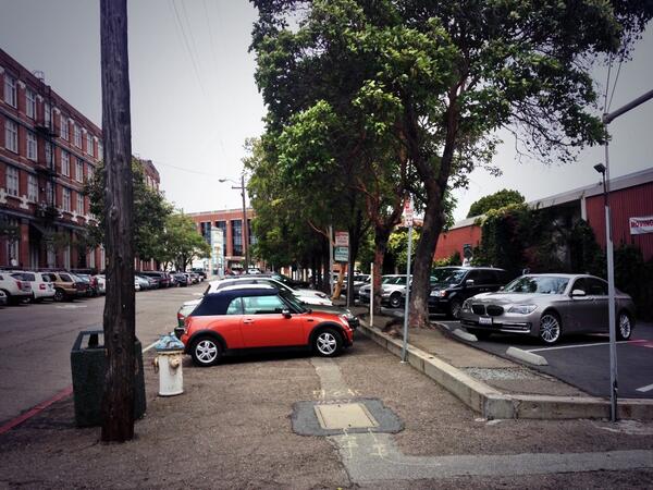 At first (and second) glance, this block in south SoMa appears to have cars parked across what clearly looks to be a sidewalk. The area in question is up on a curb, has curb-level sidewalks leading to it from the streets that intersect on either side of the block, and even has both a trash can and fire hydrant on it. If there’s somehow another a sidewalk there, it’s nowhere to be found.