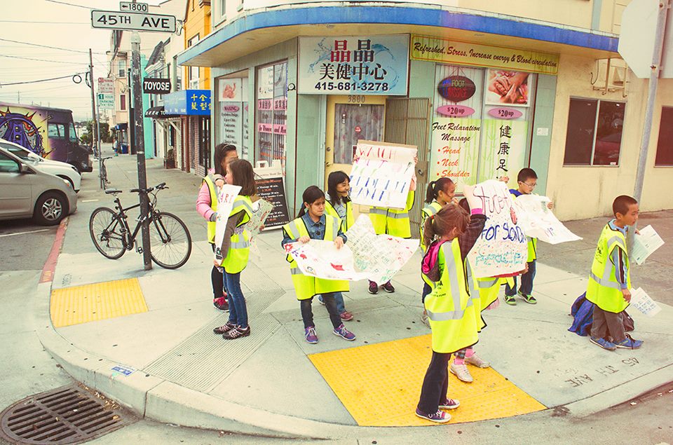 Elementary school students held their first event last week, part of a pedestrian safety campaign coordinated by the Sunset Neighborhood Beacon Center and the Outer Noriega Merchants Association. Though it’s a quiet beachside neighborhood, the Outer Sunset’s streets are notorious for their wide expanses of asphalt that encourage drivers to speed.