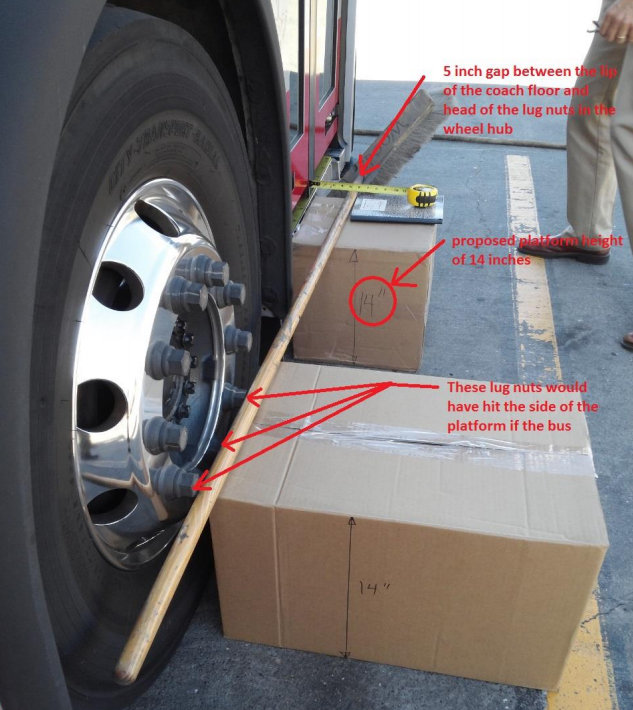 High platforms would be scratched by the “wheel lugs” that stick out from the side of bus wheel wells, the report says. The Americans with Disabilities Act apparently requires buses to stop with no more than a three-inch gap between the bus and platform. Otherwise, a “bridge plate” must be deployed from the side of the bus to the platform for wheelchair users. The wheel lugs apparently stick out five inches.