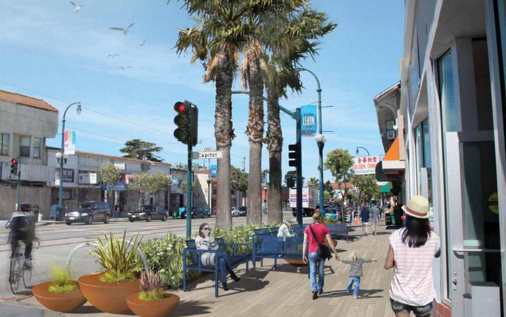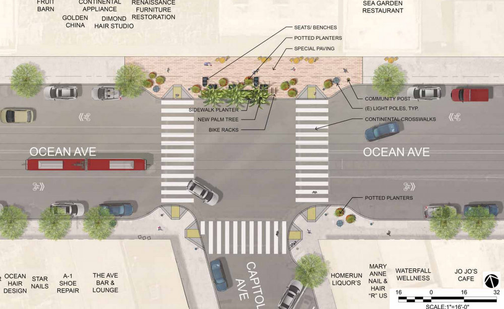On Ocean between Manor and Phelan Avenues, the near-term plans -- set for construction next spring -- include a handful of bulb-outs, new sidewalk greenery, seating, and other street fixtures at three "key" T-intersections: Ashton, Capitol, and Granada Avenues. At those intersections, Lily Langlois, the Planning Department's project manager, said "the street dead-ends at Ocean, so there's this kind of focal point, and an opportunity to build on that street pattern by creating those community gathering spaces."