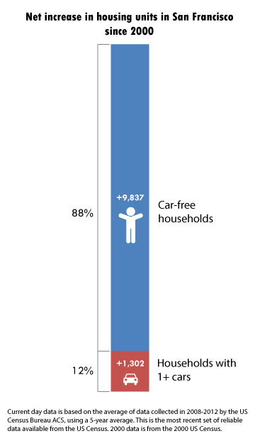 Even among the 12 percent of new households since 2000 that do own cars, many are car-lite — not each individual owns a car. SF has actually seen a net decline in two-car households despite growth in total households, while the number of households with three or more cars increased by slightly more.