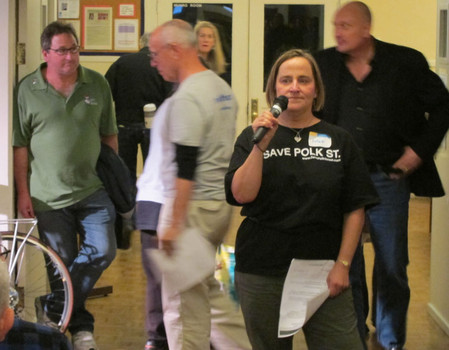 Dawn Trennert of the Middle Polk Neighborhood Association, who has been seen at past meetings wearing a “Save Polk St.” t-shirt, spoke at the Van Ness hearing and echoed many of the same refrains calling for the preservation of parking and unfettered car movement.