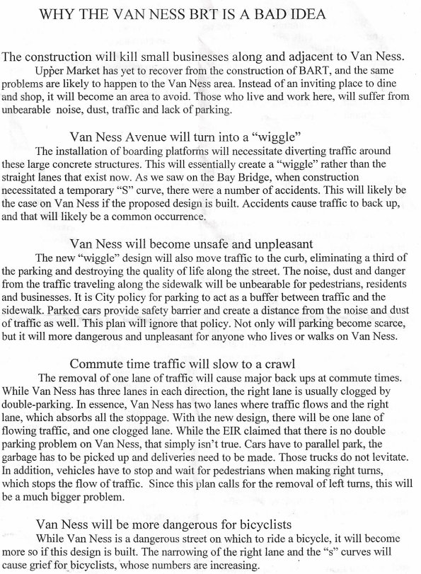 Most of the complaints about Van Ness BRT were about removing parking and banning left turns, and claimed that transit doesn’t need the estimated 30 percent speed increase. Some also complained about removing five of 16 bus stops to streamline the route.