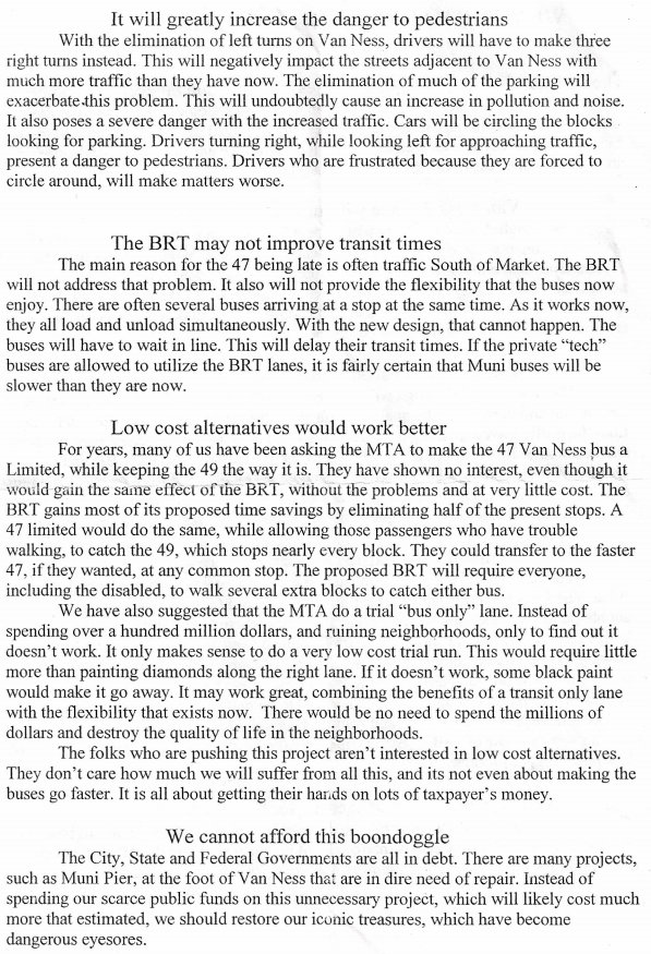 “Many of our members have expressed extreme concern over the Van Ness BRT, and how it will impact our neighborhood, because they can’t park on Van Ness, and they’re used to parking on Van Ness, because they need to make left-hand turns, and they can’t do it on Van Ness to visit the nearby streets like Polk Street,” said Trennert. “Polk Street is faced with its own very grave issues with splitting up portions of Polk for bicycle use only, reducing parking on Polk.”