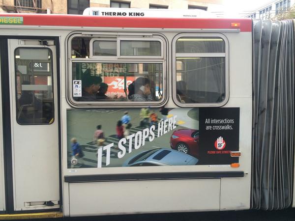 The ads have started rolling out on Muni buses. One depicts cars stopped in front of a busy, unmarked crosswalk, with the text, “It Stops Here.” A side panel says “all intersections are crosswalks” — a message aimed at combating the misconception that crosswalks aren’t legal unless they’re marked.
