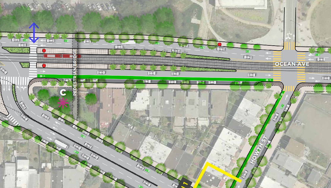 The plans do include bike improvements on a block of Howth, a residential street that runs between Ocean and Geneva and connects to a series of parking lots for the City College campus. The block would get a curbside contra-flow bike lane on the southbound side where car parking is already prohibited, and green-backed sharrows would run in the other direction. That won’t do much to improve connections in the east and west directions, however.