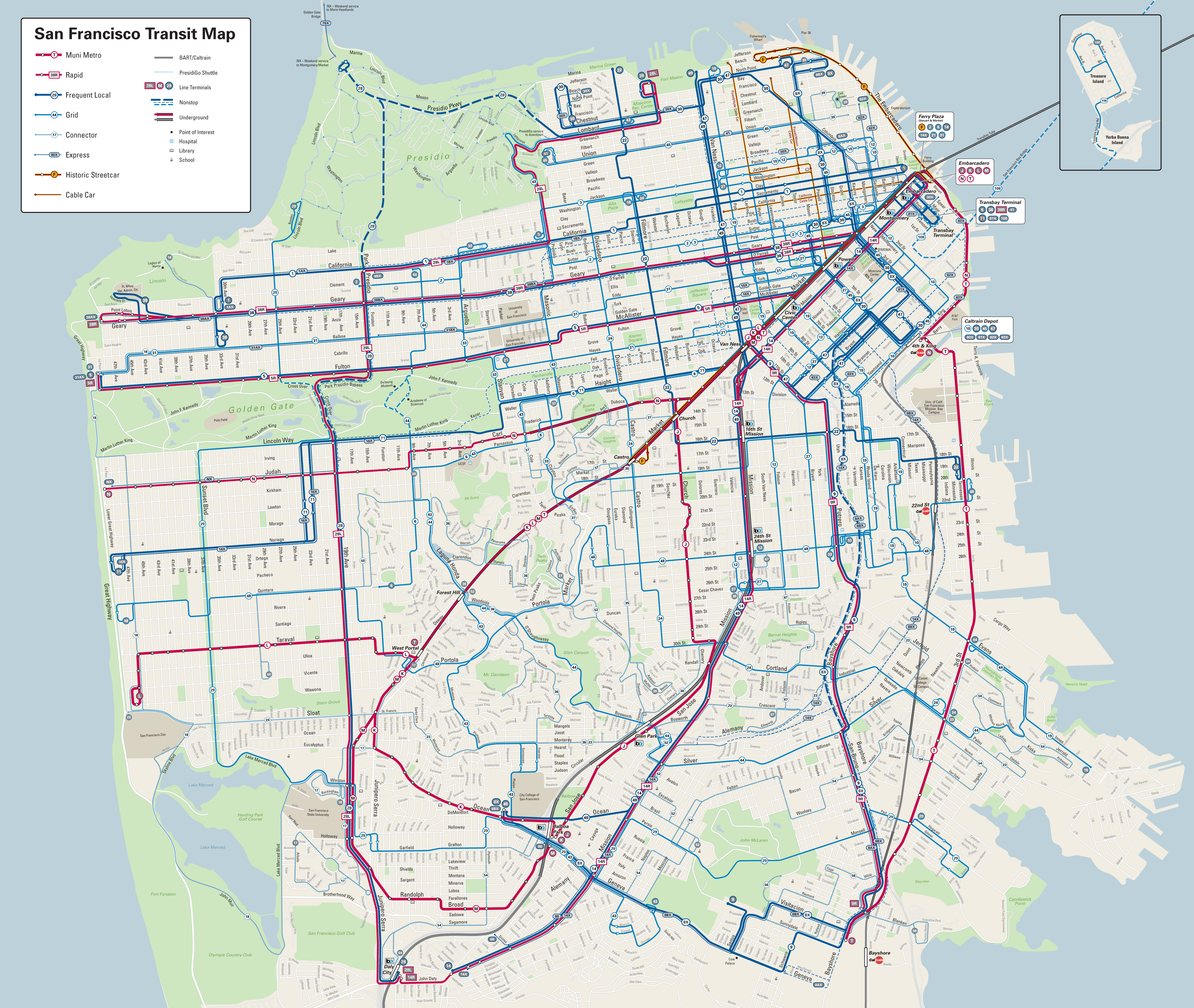 The map also incorporates service changes that streamlined some routes in recent years, such as the new contra-flow transit lane that straightens out the 6 and 71 lines on Haight Street, the new Muni-only left-turn lane for the 29 at Lincoln Way and 19th Avenue, and the two-way traffic conversion at the end of McAllister Street which has sped up the 5. Muni will re-align routes and change frequencies on another 30-plus lines as part of the Transit Effectiveness Project.