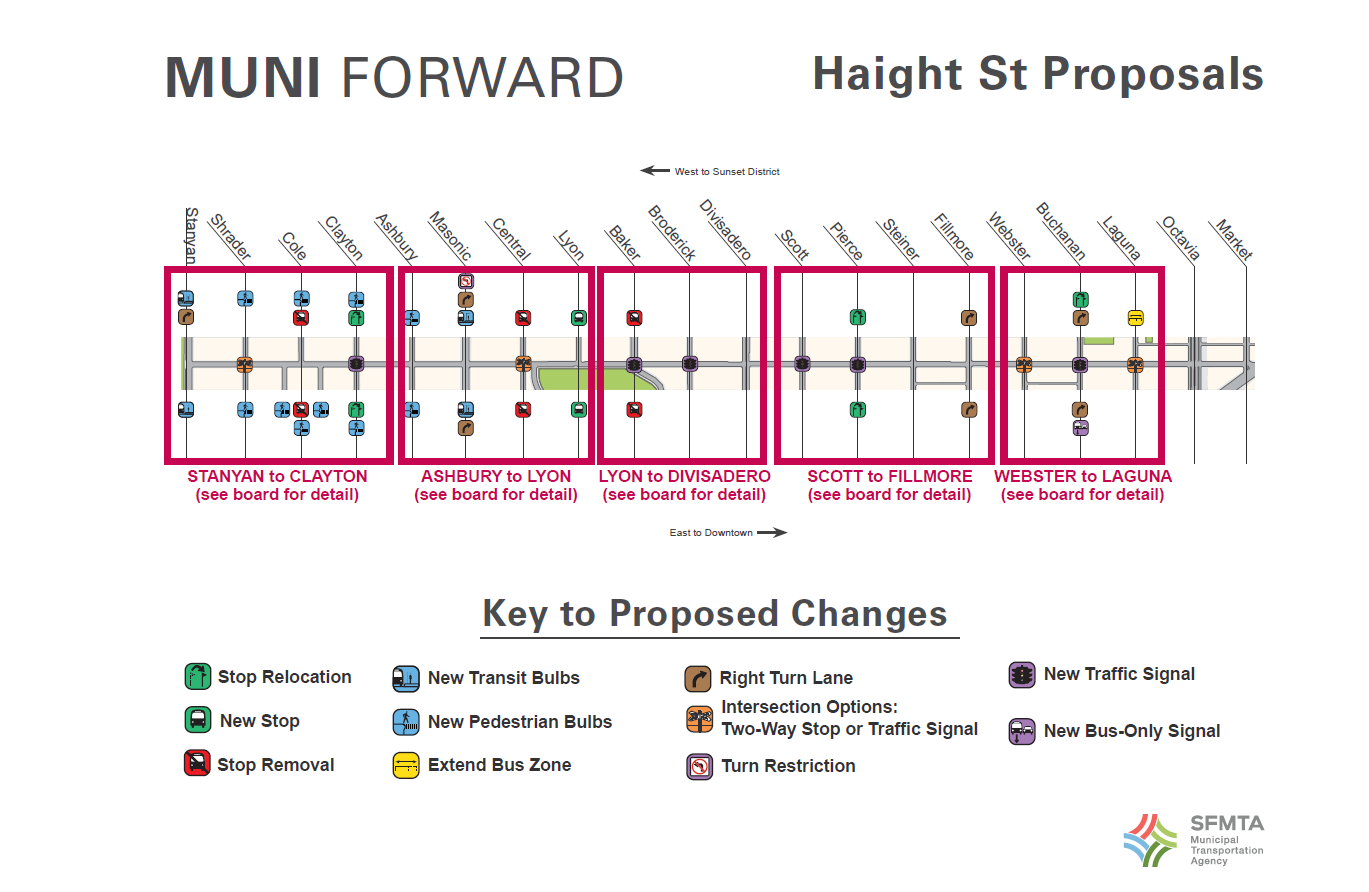 Under Muni Forward’s “Rapid” plans for the 71, almost all stop signs along Haight will be replaced with either transit-priority traffic signals, or two-way stops combined with traffic calming treatments. The signals, which stay green when they detect buses, would be installed at Clayton, Baker, Broderick, Scott, Pierce, and Buchanan Streets. Either a two-way stop or a new signal would be possible at Shrader, Central, Webster, and Laguna Streets.