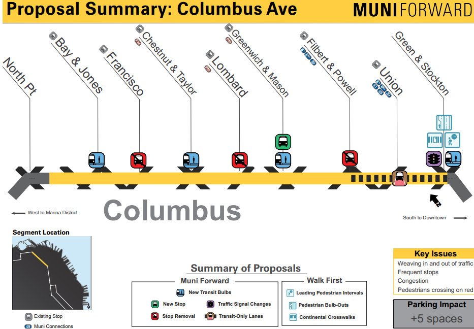 The plans, part of the SFMTA’s “Muni Forward” program, include transit-only lanes, bus bulb-outs and boarding islands, transit signal priority, and stop consolidation on Stockton, Kearny, and North Point Streets, as well as Columbus Avenue. On two street segments where traffic lanes are too narrow to fit buses, car parking and traffic lanes would be removed to provide more maneuvering space.