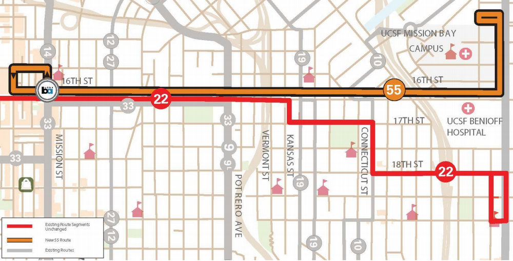 Muni plans to launch a new bus line this month to beef up service along eastern 16th Street, connecting the BART station at Mission Street to the soon-to-open University of California SF hospital at Mission Bay. The 55-16th Street route would complement existing 22-Fillmore service on 16th, extending beyond the 22’s endpoint all the way to the east end of 16th and then north on Third Street towards its terminus at UCSF.