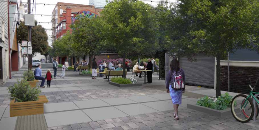 While the concept has been implemented more widely in northern Europe, the guide notes, similar ideas have been applied in Los Angeles, Austin, Chicago, Seattle, and Portland, Oregon. In SF, a section of Linden Street was redesigned as a living alley in 2010, and plaza projects have been implemented in SoMA on Annie Alley and Mint Plaza. In Oakland, two alleys in the Temescal neighborhood were converted into pedestrianized retail streets that delivery vehicles can enter.