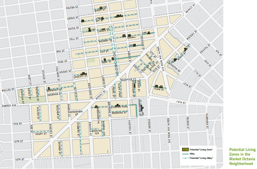 The new guide, which started development in mid-2013, focuses on the potential for living alleys in Hayes Valley and just south of Market Street near Octavia Boulevard, since it was conceived in the Market-Octavia Area Plan with the removal of the Central Freeway. But in the future, as those initial alley transformations are implemented, the city will look at expanding them citywide, said the Planning Department’s David Winslow.
