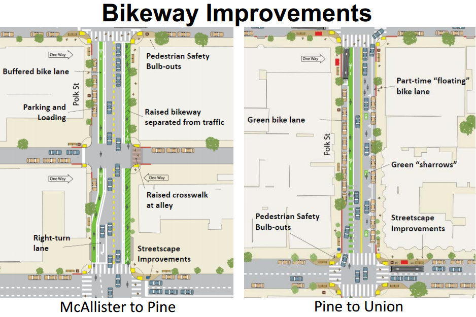 “As someone who’s a beginning cyclist… if you want more people like me driving less, I’m going to want to see protected bike lanes,” said Kim. “That’s just the reality.” With heavy motor traffic and steeper grades on nearby streets, she said, “Polk Street is the only corridor that we can have a protected, green bike lane for the entire north-south” route. She also said she was “disappointed” about the removal of the bike lane on the block between California and Pine.