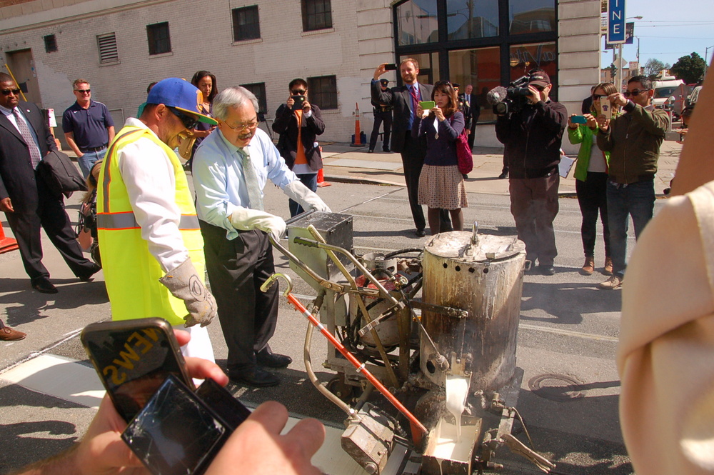 The press conference seemed peculiar. It was apparently called by the mayor’s office at the last minute to publicize the SFMTA’s ongoing striping of better crosswalks along Geary Boulevard. There wasn’t a clear impetus or announcement, which confused some of the reporters who showed up. There was, however, a photo op for Lee to push a thermoplastic striping machine to demonstrate how zebra-style crosswalks are installed.
