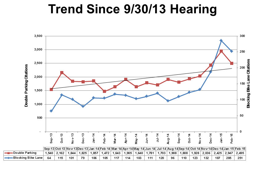 Double-parking tickets have recently been on the upswing, however, with monthly citations rising from 1,808 in September to 2,947 in January, though they dropped again slightly in February to 2,495 [PDF]. Compared to all double-parking tickets, bike lane violations increased at a faster rate, from 110 in September to 285 in January.