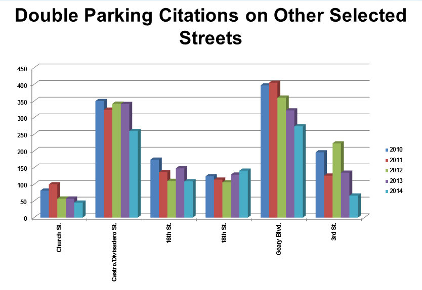 Double-parking tickets dropped steeply on busy Muni corridors such Geary Boulevard and Third Street, though transit-only sections on both corridors have received the red paint treatments, and Muni has been installing enforcement cameras on all buses, which allow tickets to be mailed to transit lane violators. It’s possible those measures could have reduced double-parking, though Samii didn’t mention if they did.