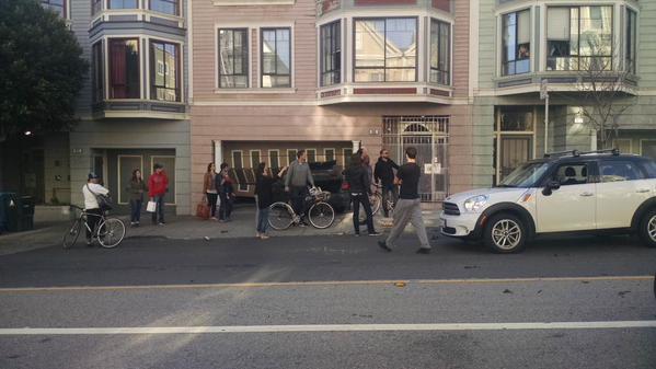 At around 5:30 p.m., the driver, described by witnesses as a Hispanic woman, plowed through three people on bikes at Scott and Fell after she rear-ended the driver of a Mini Cooper on Fell. The driver reportedly turned left into the oncoming left-turn bike lane on Scott, plowing into the three cyclists. The driver then slammed into a parked car, which was wedged into a garage, as she escaped.