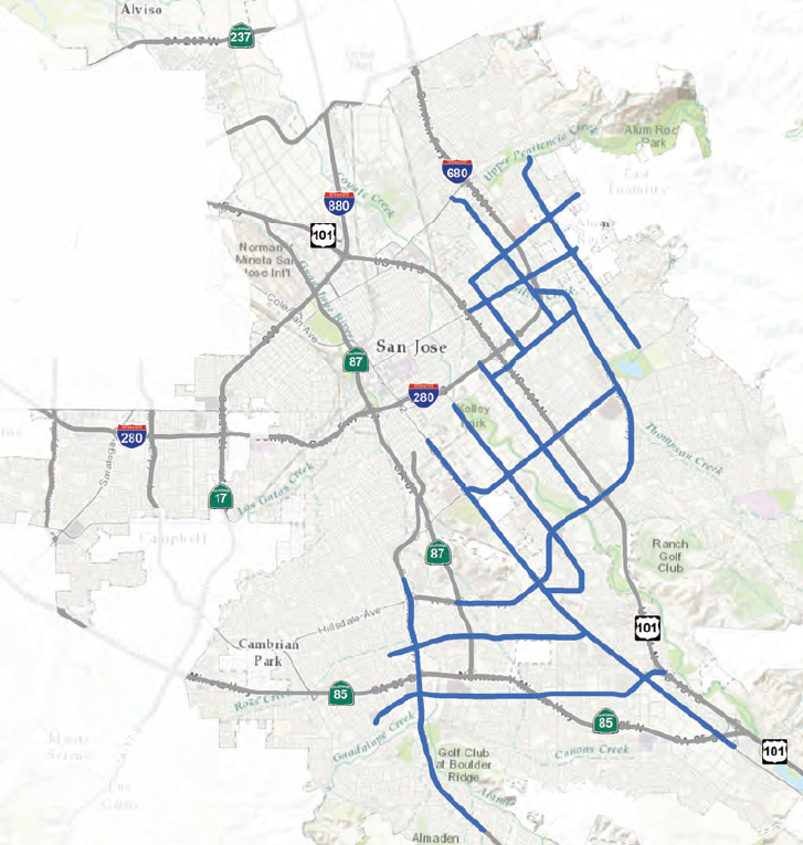 SJ’s Vision Zero plan identified 14 streets as the highest priorities for safety improvements, based on an SJDOT analysis of the past five years of crash data that found they have the highest concentrations of severe injuries and fatalities. All are high-speed multi-lane roads in eastern and southern San Jose.