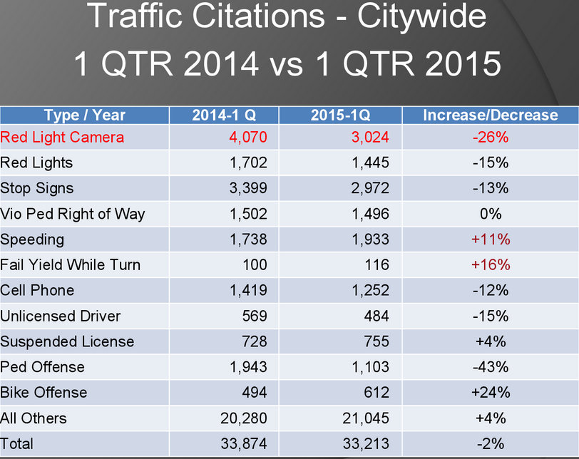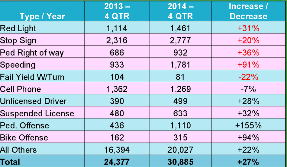But that statistic masks troubling enforcement trends. For instance, tickets for failure-to-yield, a leading cause of pedestrian fatalities, actually declined in the last quarter of 2014 compared to the last quarter of 2013, from 104 to 81.