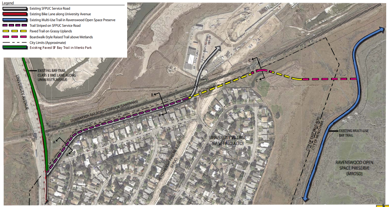 The missing section lies within both East Palo Alto and Menlo Park, and is subject to a number of regulatory agencies where the trail will cross protected wetlands in the Ravenswood Open Space Preserve. The multi-jurisdictional nature of the project and complex political environment has delayed it for decades while every other section of the San Francisco Bay Trail in the mid-Peninsula region has been built or improved. The network of continuous off-street trails now stretches nearly from the Union City BART Station to downtown San Jose, except for this remaining gap.