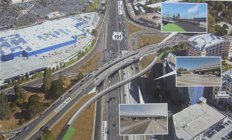 Crossing the highway, University Avenue is a double-span bridge built in 1957. Currently, the only way to cross the interchange on foot or bike is via a four-foot wide sidewalk on one of the University bridges, which is “in dire need of repair,” Bozorginia told the Public Works and Transportation Commission last Wednesday. “The infrastructure has been inadequate for a number of years.”