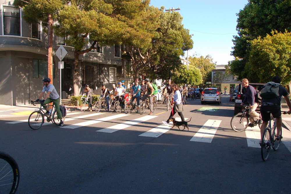 One middle-aged man was spotted walking his dog in a crosswalk at Waller and Pierce Streets, a block from the bike backup. As he entered the crosswalk, he entered the path of three people on bikes making a slow left turn after making a full stop. All parties paused, and the riders let the man walk by first.