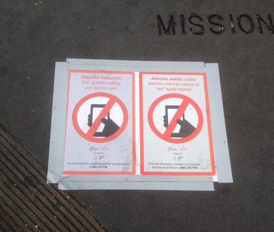 Flyers warning people not to walk across the street while looking at their phones, or against traffic signals, were recently posted on corners along Mission Street in the Mission District.