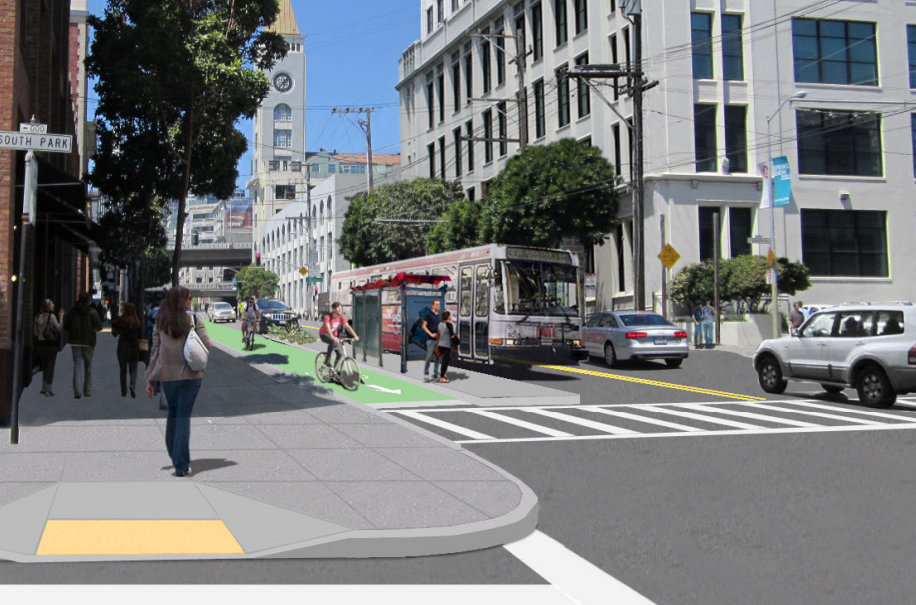The redesign [PDF] will remove two of Second Street’s four car traffic lanes and bring one of the city’s first routes with raised bike lanes protected from motor traffic by curbs and parked cars. Muni boarding islands will also be installed to allow buses to make stops in the traffic lanes and passengers to alight without conflicting with bike traffic.