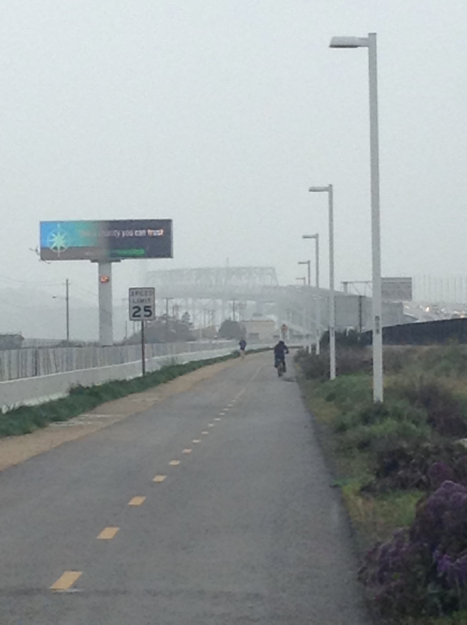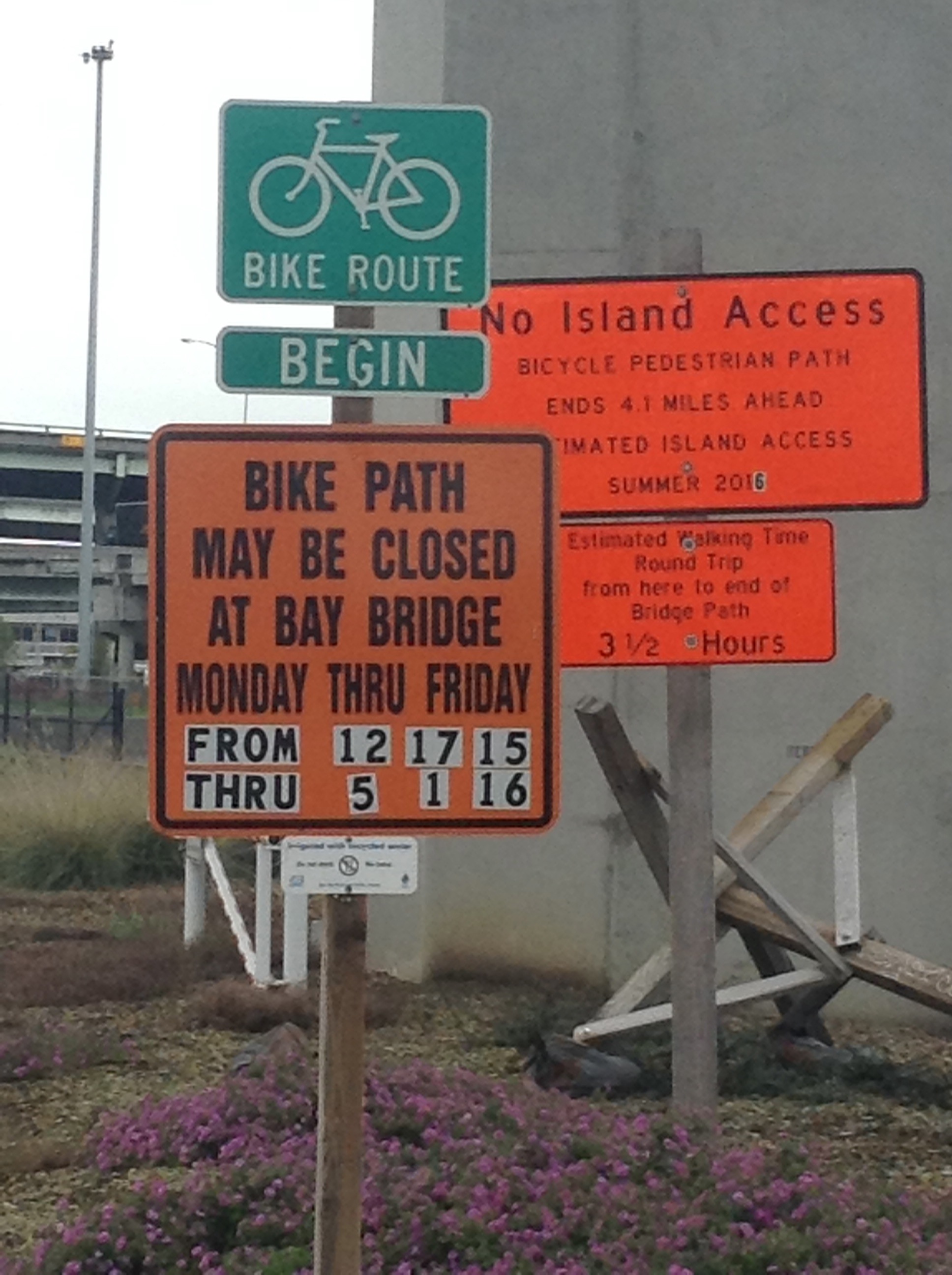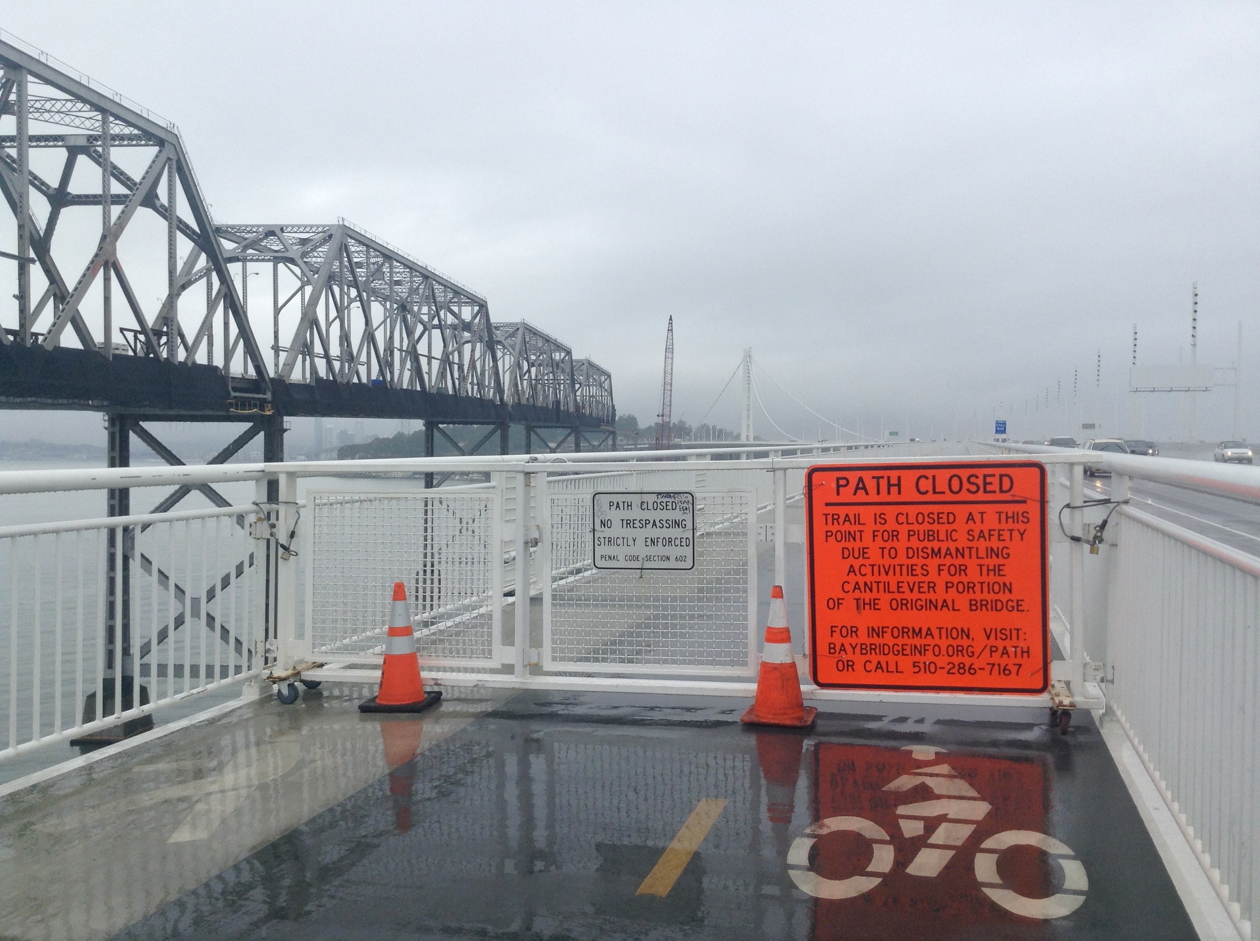 Your intrepid Streetsblog reporter braved a few rain drops to check out the Oakland Bay Bridge bike path yesterday afternoon and found it still open, at least partway, despite Caltran’s recent announcement that it would be completely closed until April.